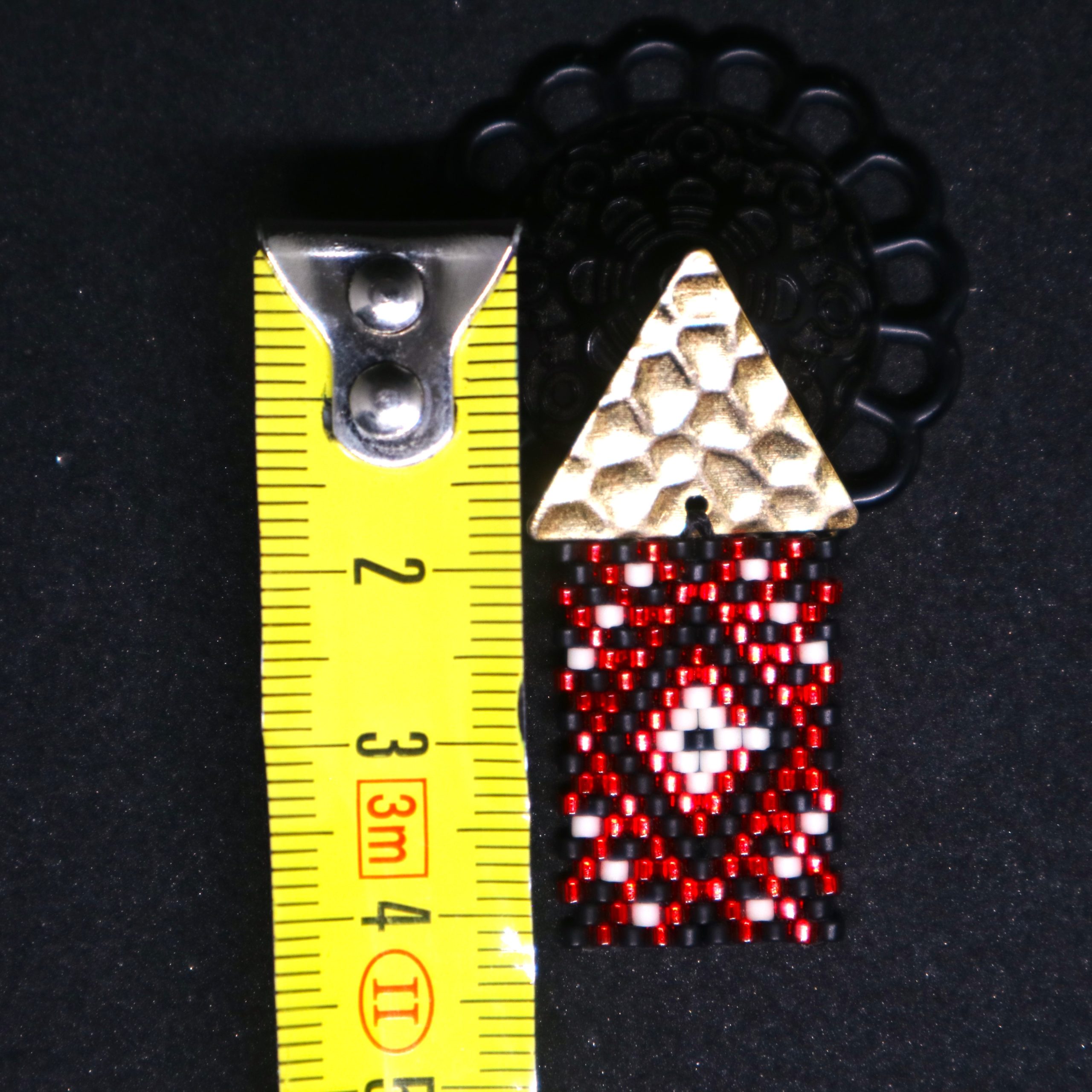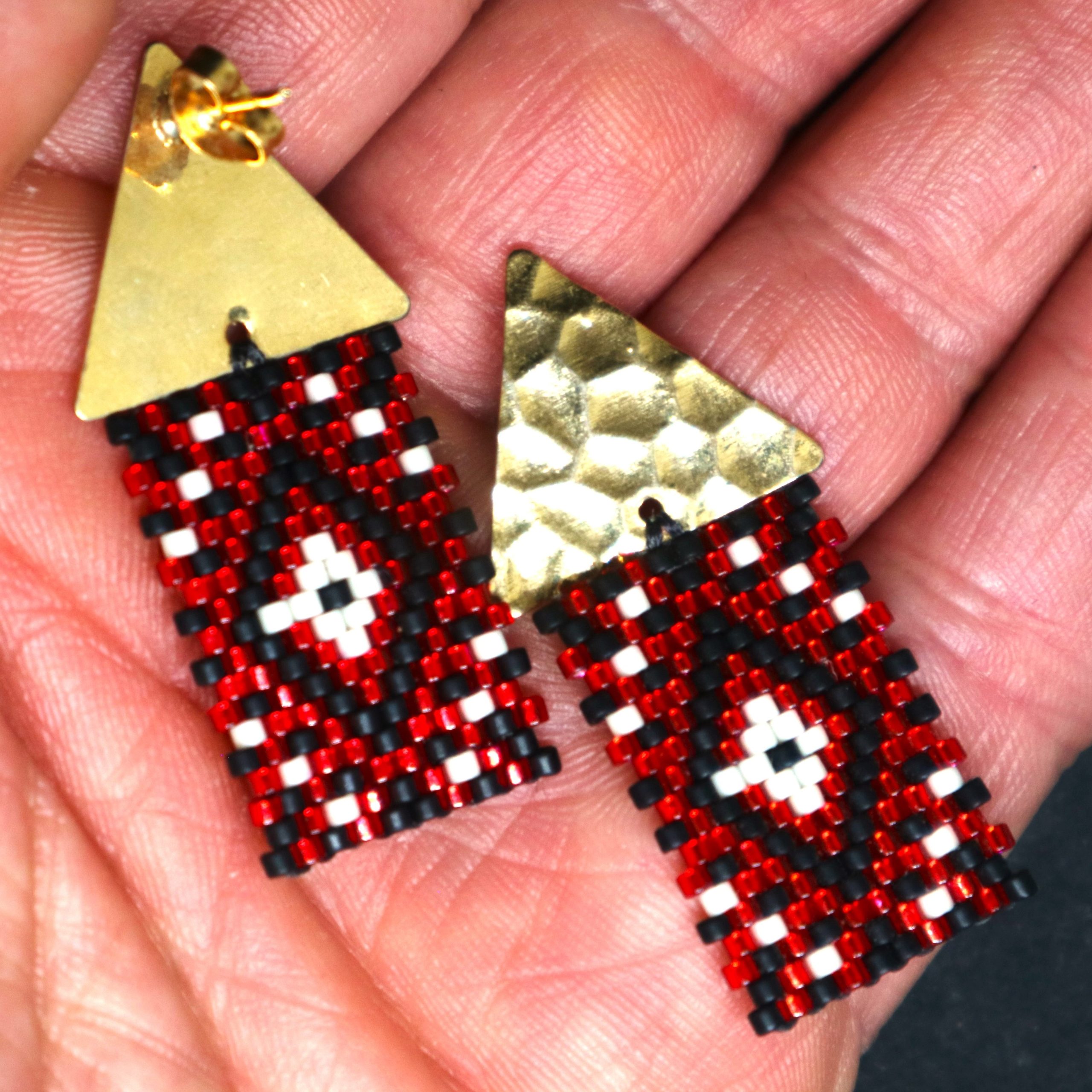 Pendientes elaborados con cuentas de miyuki (cuentas de cristal japonés) de colores rojo, negro y blanco. Llevan la forma de un rombo, símbolo étnico de mucha importancia para la comunidad indígena inga del Putumayo, que invoca la unión, la familia y la fertilidad. Miden 4,2cm de largo y pesan muy poco. El herraje, de auricalco (cobre y zinc) pesa muy poco. Comprados a precio justo directamente al productor artesano John Tisoy al precio estipulado por él. Con tu compra impulsas negocios de pequeños productores y tendrás la satisfacción de llevar una pieza única 100% artesanal