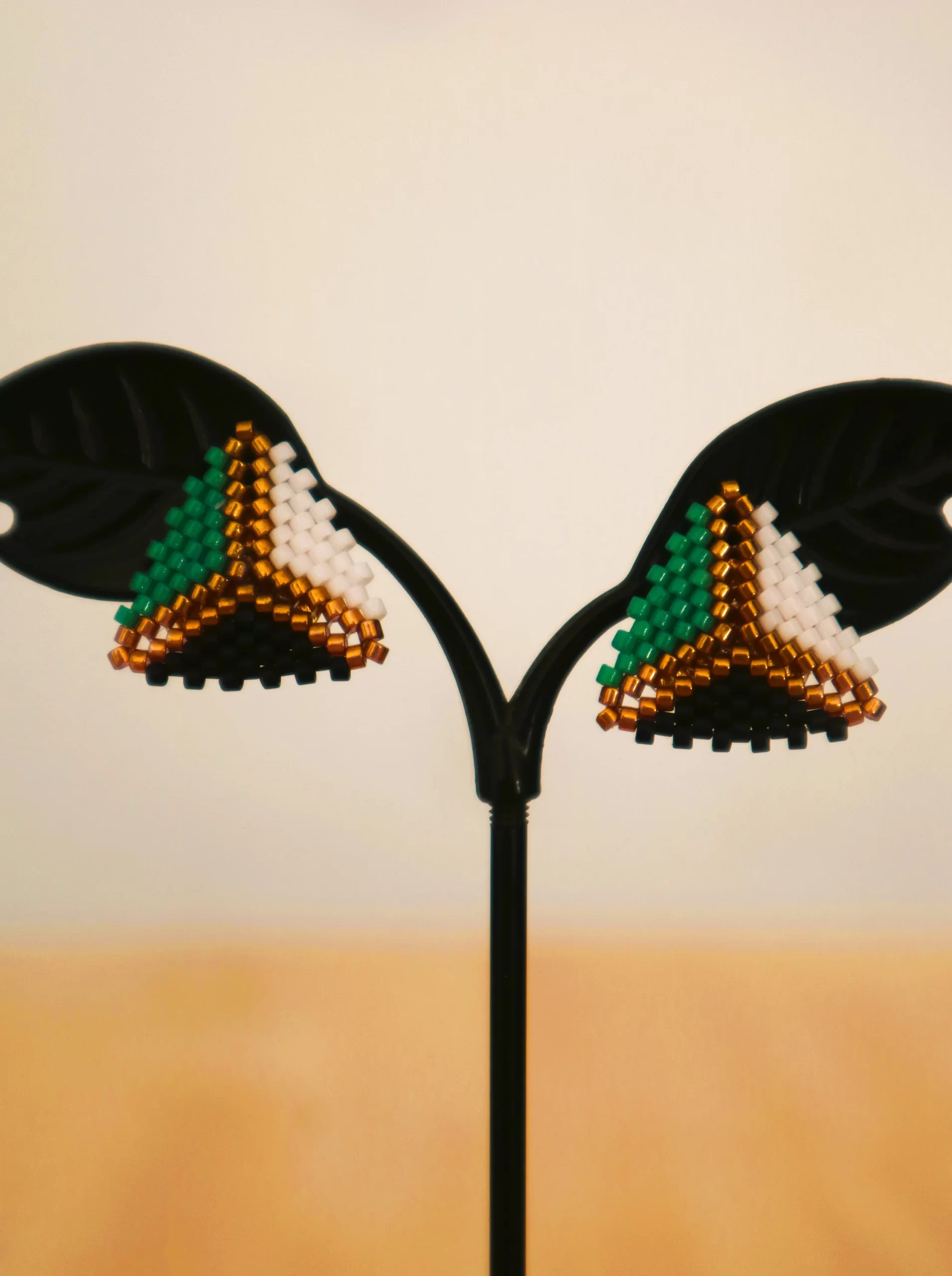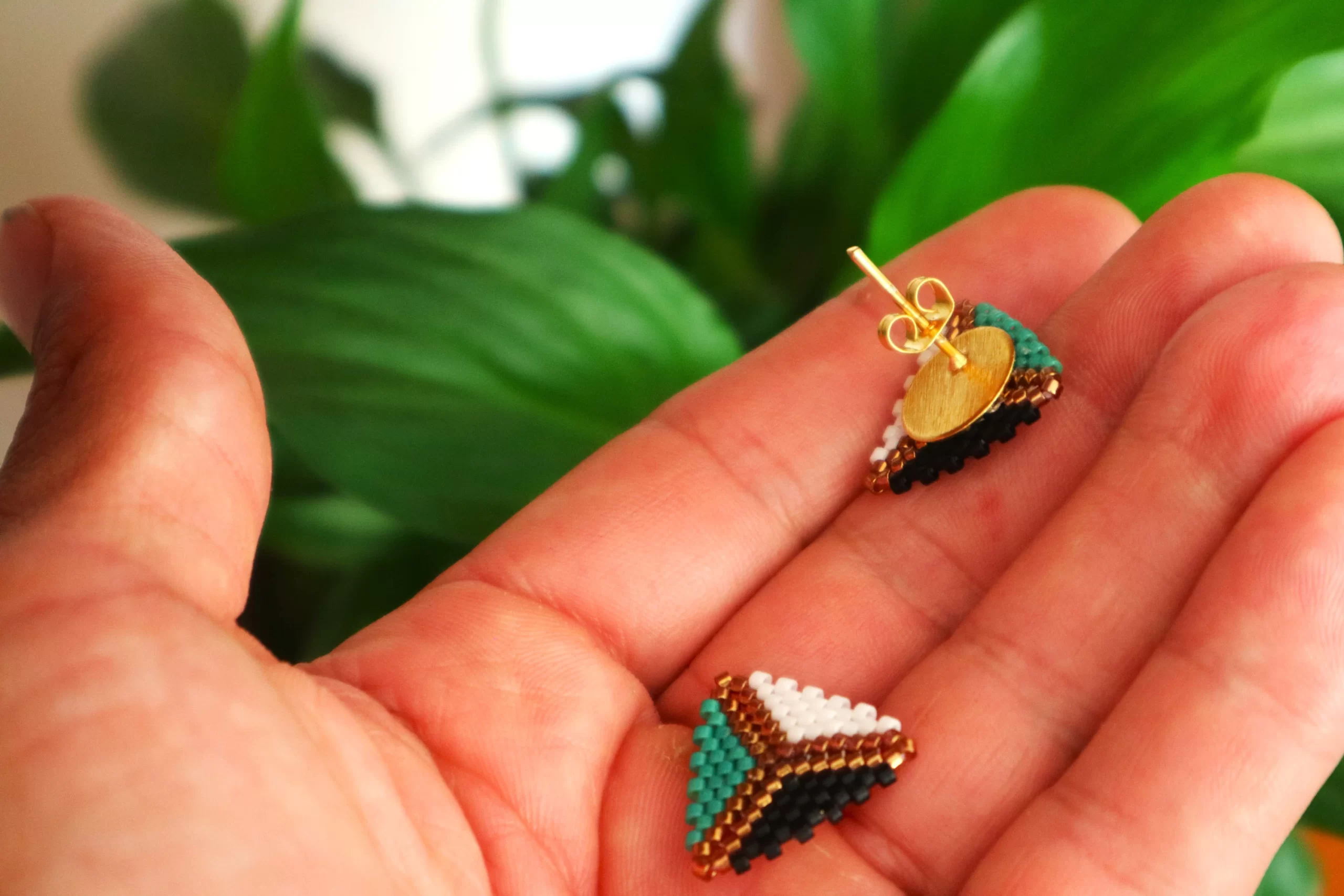 Hermosos pendientes hechos en miyuki, cuentas de delicado cristal japonés tejidas, que dan lugar a lindas creaciones artesanales. Forma de triangulo de Reuleaux. Colores sobrios, verde turquesa, blanco, negro, y dorado, con herraje de botón invisible. Muy elegantes, pero al mismo tiempo se dejan llevar en la cotidianeidad.