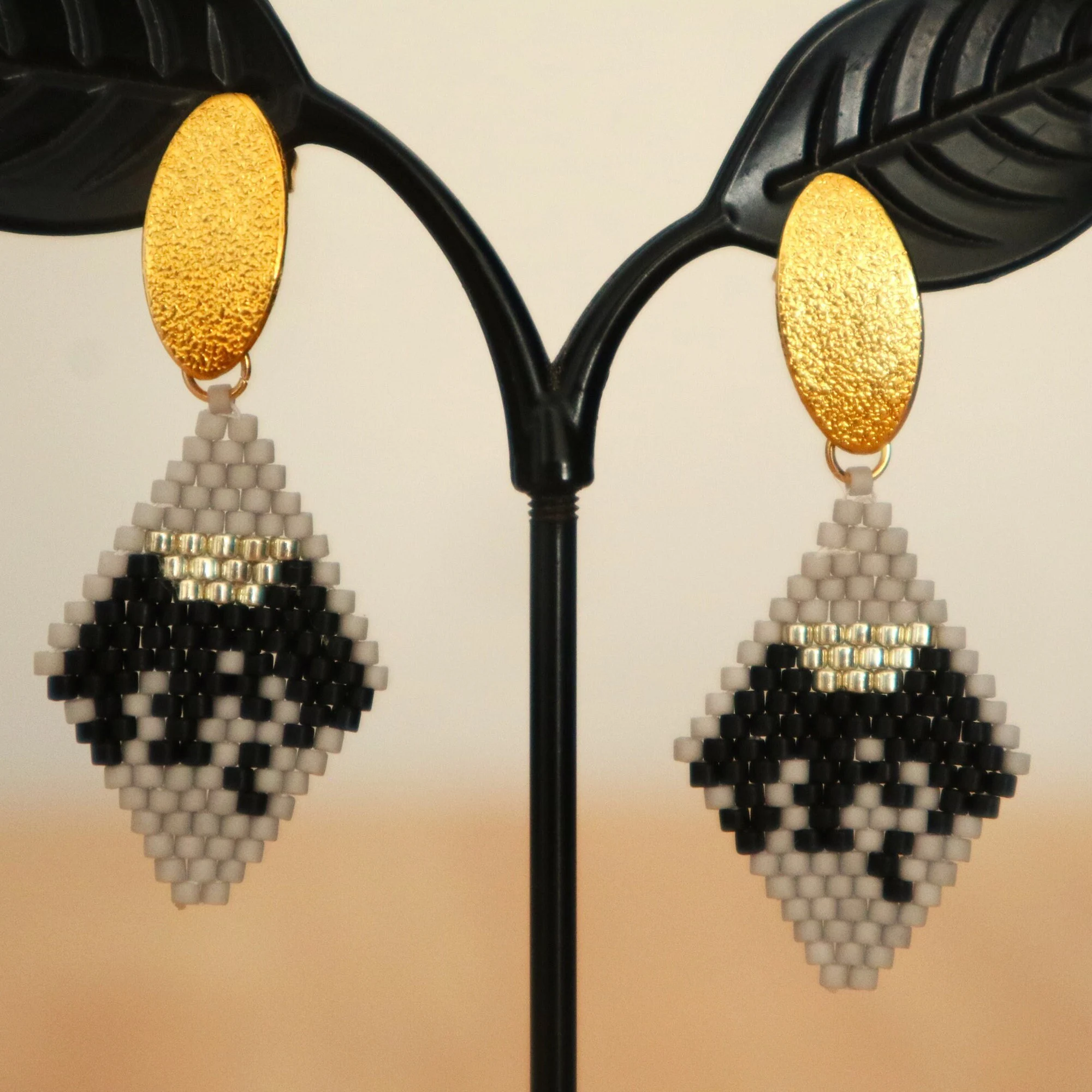 Hermosos pendientes hechos en miyuki, cuentas de delicado cristal japonés tejidas, que dan lugar a lindas creaciones artesanales. Forma de rombo. Colores sobrios y elegantes, distintos tonos de gris, plata y negro con herraje dorado con forma ovoide. Hechos en el taller de Creaciones Doss, en Bogotá. Muy elegantes, pero al mismo tiempo se dejan llevar en la cotidianeidad.