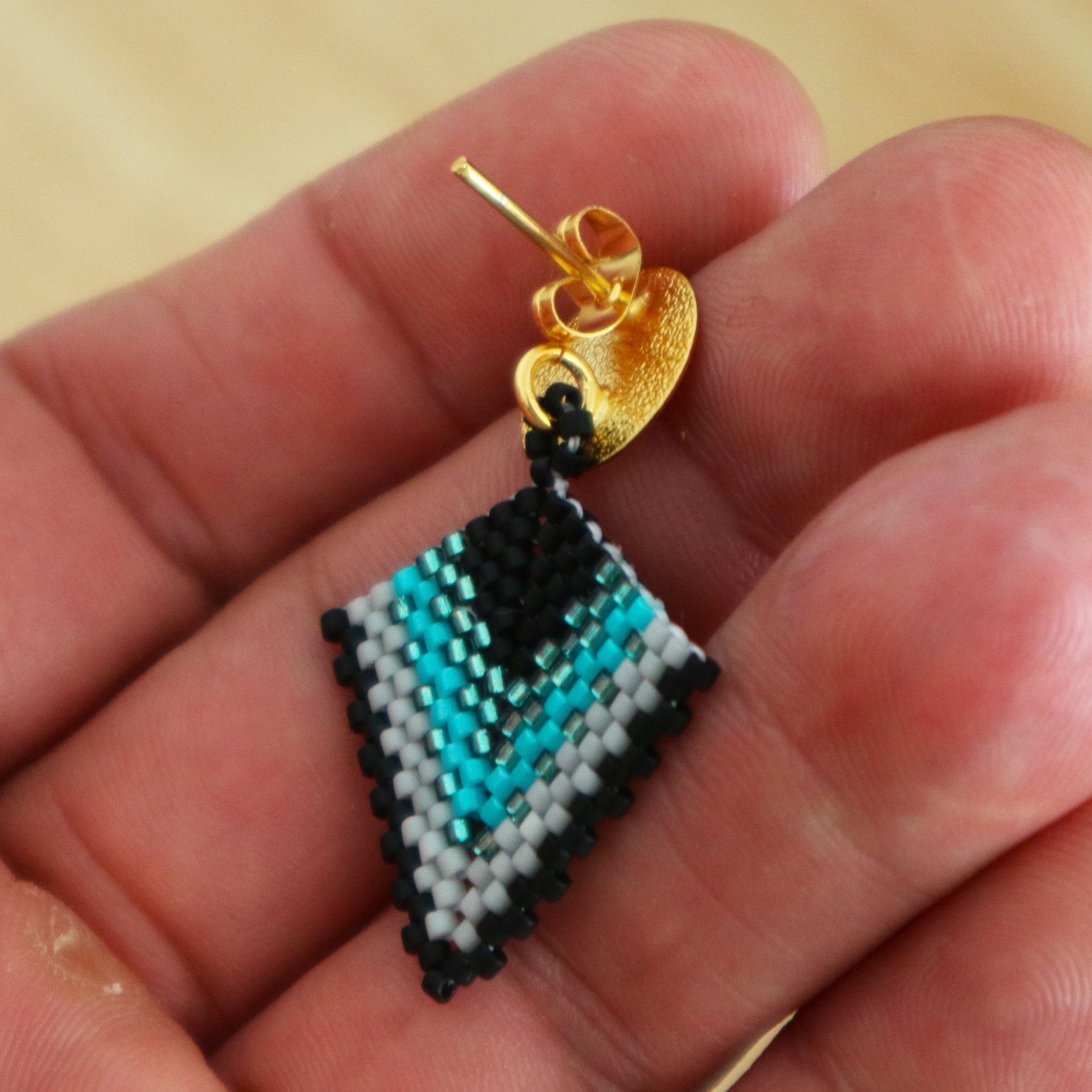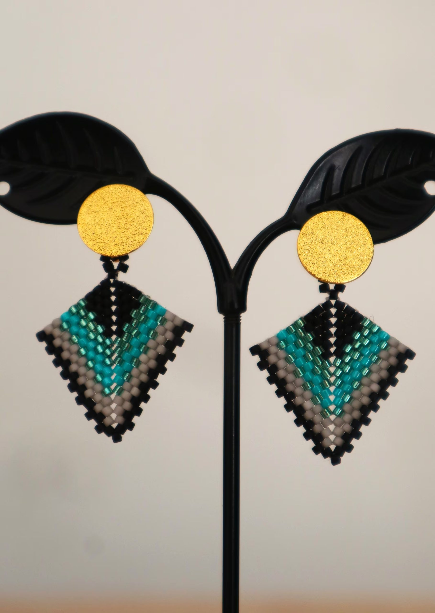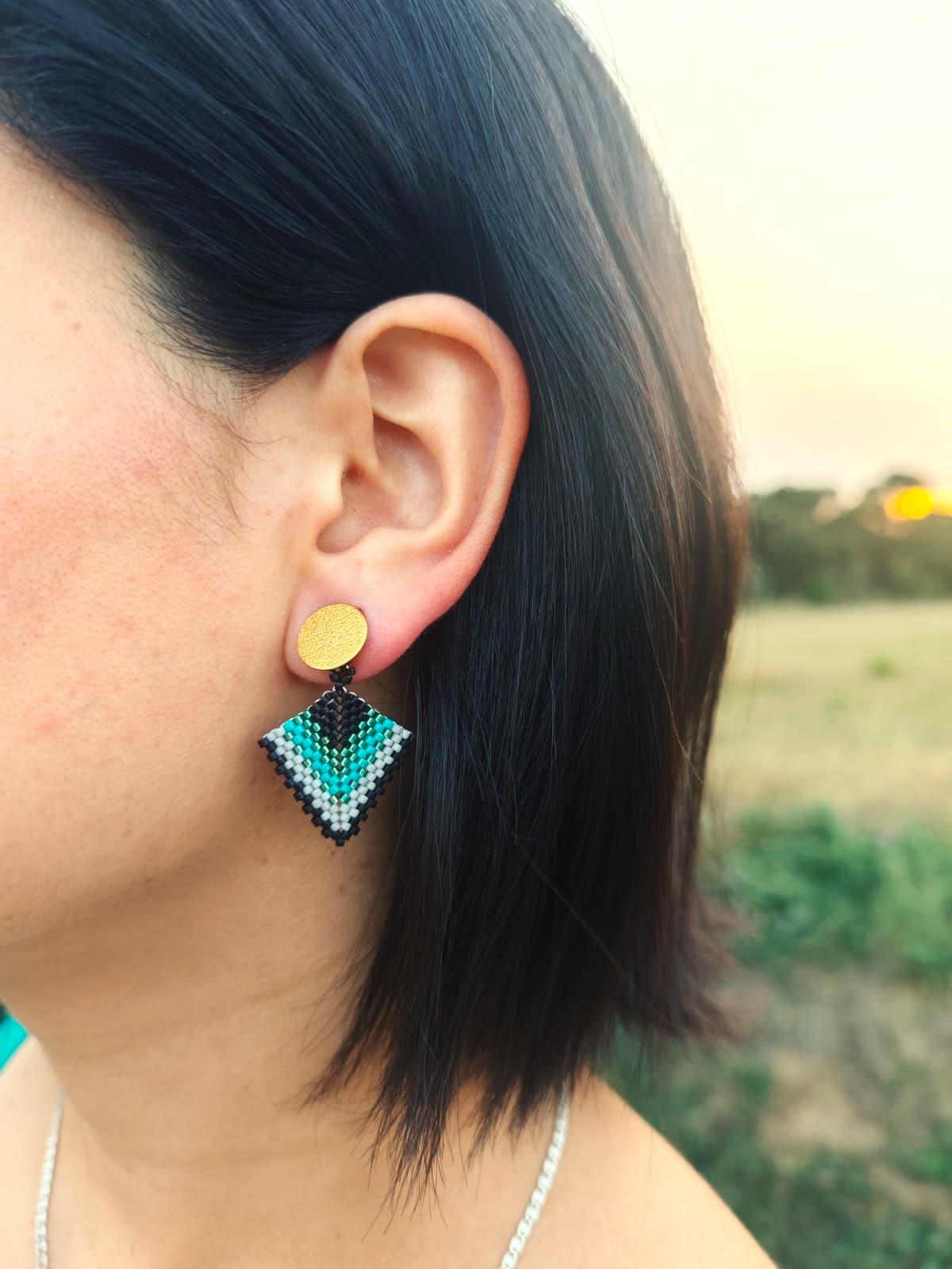 Hermosos pendientes hechos en miyuki, cuentas de delicado cristal japonés tejidas, que dan lugar a lindas creaciones artesanales. Colores sobrios, verde turquesa, grises, negro, combinados con herrajes redondos texturizados de acero hipoalergénico . Muy elegantes, per al mismo tiempo se dejan llevar en la cotidianeidad.